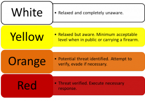 Οι διακόπτες μας ανοιχτοί. Σ’ αυτή την κατάσταση η επαγρύπνησή μας πρέπει να βρίσκεται όταν βαδίζουμε, σε έρημους δρόμους, σε επικίνδυνες περιοχές, σε κάποιο υπόγειο χώρο στάθμευσης κ.λπ.. Το κίτρινο χρώμα δηλώνει ότι πρέπει να έχουμε μία ήρεμη επιφυλακή σε μέρη ή καταστάσεις όπου είναι πιθανόν να αντιμετωπίσουμε κάποιον κίνδυνο.